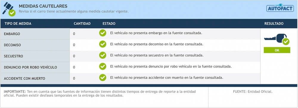 Entre las medidas cautelares más conocidas en Colombia, es posible encontrar al menos 5 casos que influyen en la compraventa de un carro usado y que aparecen en el Informe Autofact, tal como veremos más adelante.