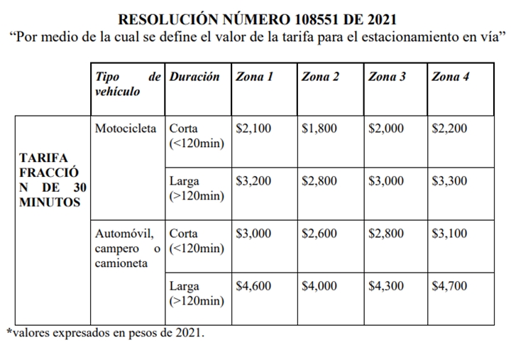 Ten en cuenta que estas tarifas corresponden a una referencia en la denominada Zona 1. En cuanto a las otras zonas de parqueo pago en Bogotá, los valores quedaron así: