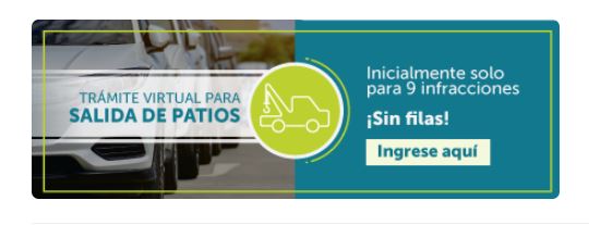 Entrar en el sitio web de Movilidad y ubicar el banner en Trámite Virtual para salida de patios. Al seleccionar, observará un mensaje que indica que este trámite está autorizado sólo para vehículos inmovilizados para las infracciones: B01, C14, D02, H02, D03, D04, D05, D06 y D07.